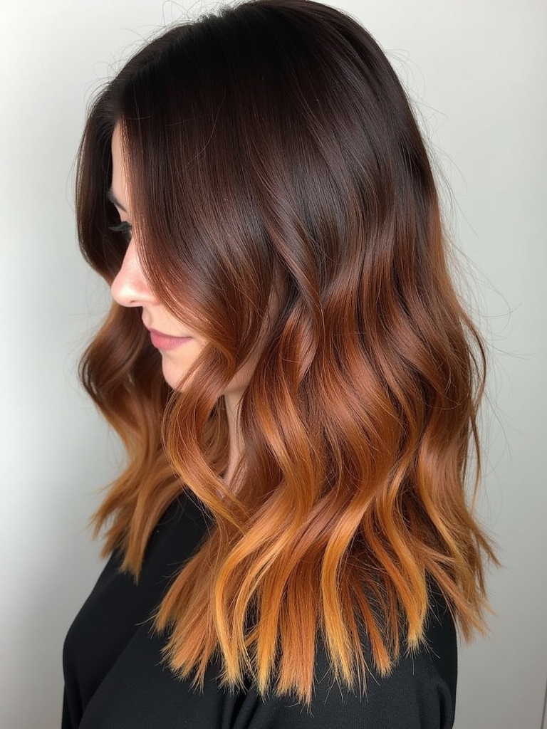 Capture the essence of autumn with the Autumn Sunset Ombre for your Fall Hair Colors For Brunettes. This captivating blend of warm, rich hues gradually transitions from your Rich Brunette Hair to shades reminiscent of a stunning fall sunset. Daringly different from typical Dark Hair Color Ideas, this ombre offers a dynamic yet harmonious blend of colors. The seamless integration of Fall Highlights For Brown Hair mimics the natural transition of colors, creating a subtle Brunette Balayage Hair effect. As one of the season’s most sought-after looks, it flawlessly aligns with the vibrant Fall Hair Trends 2025. To add dimension and movement, a Dark Caramel Balayage can be applied near the roots, seamlessly blending the colors together. And for a touch of golden radiance, a subtle Warm Honey Blonde can be woven in near the ends, catching the light and adding a touch of sun-kissed charm. With an ombre such as this one, Hair Color Ideas For Brunettes take on a whole new level of style and sophistication. The sunset shades illuminate your Dark Fall Hair, making it a stunning representation of the season’s Fall Hair Color Trends.