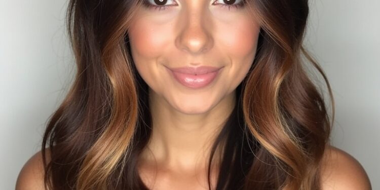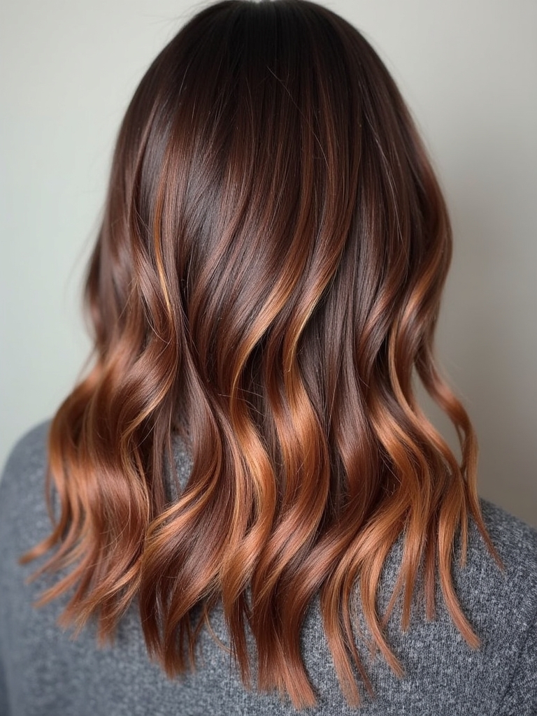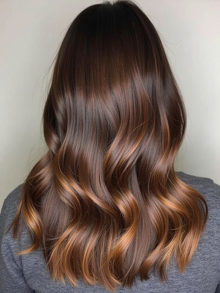 Sprinkle your Rich Brunette Hair with the radiant warmth of copper coin highlights. This is a brilliant way to integrate Fall Highlights For Brown Hair that catch the light and add dimension to your Dark Fall Hair. It’s a fantastic twist on traditional Dark Hair Color Ideas, injecting vibrancy and playfulness into your look. Copper coin highlights are an excellent option for a subtle Brunette Balayage Hair, blending seamlessly with your existing brunette base. This approach aligns with Fall Hair Trends 2025, offering a modern take on classic brunette styles. Consider incorporating a Dark Caramel Balayage effect, focusing the copper highlights towards the ends of your hair for a sun-kissed look. A touch of Warm Honey Blonde can be woven into the copper highlights for added brightness and dimension. These are gorgeous Hair Color Ideas For Brunettes that elevate your style with a touch of warmth and sophistication. Copper highlights are perfect for Fall Hair Color Trends, bringing a touch of autumn’s brilliance to your locks.