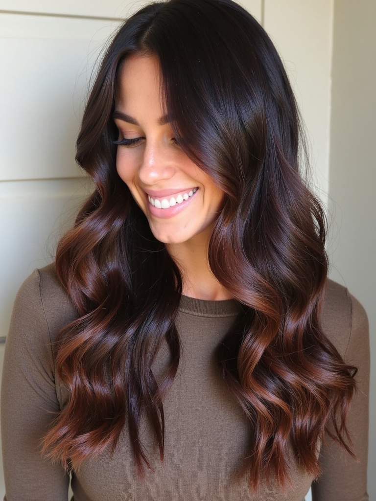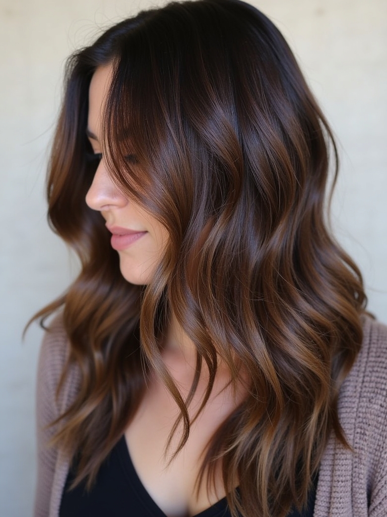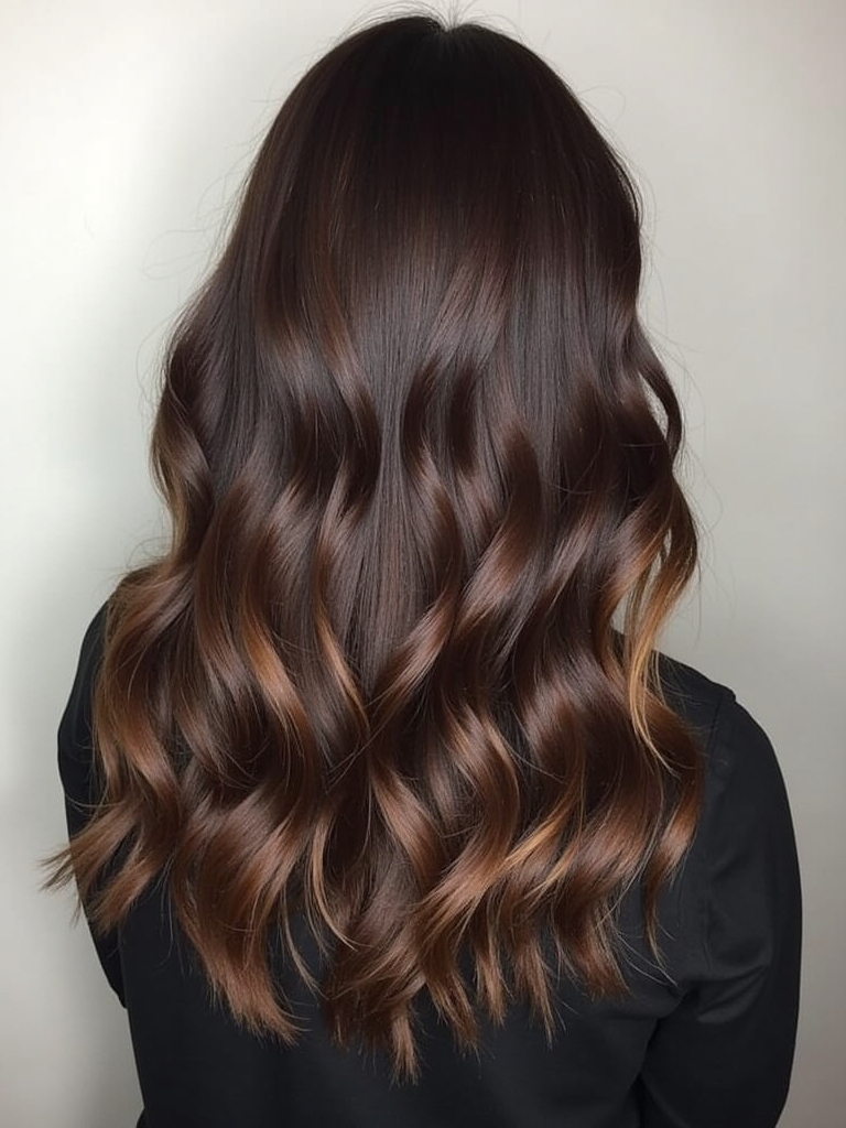 Indulge in the perfect blend of rich and creamy with Espresso with Cream for your next Fall Hair Colors For Brunettes. This delightful combination adds depth and dimension to your Rich Brunette Hair, creating a captivating and sophisticated look. This style is a unique departure from the typical Dark Hair Color Ideas, offering a harmonious balance of darkness and light. Imagine delicate Fall Highlights For Brown Hair in shades of caramel and cream dancing through the espresso base, creating a subtle Brunette Balayage Hair effect. As one of the season’s most sought-after styles, it perfectly aligns with the trending Fall Hair Trends 2025. For added depth and dimension, a Dark Caramel Balayage can be applied near the roots, seamlessly blending the colors together. To add a touch of sun-kissed radiance, a subtle Warm Honey Blonde can be woven in near the ends, catching the light and enhancing your features. With this blend, Hair Color Ideas For Brunettes reach a new level of style and sophistication. The creamy highlights illuminate your Dark Fall Hair, making it a stunning representation of the season’s Fall Hair Color Trends.